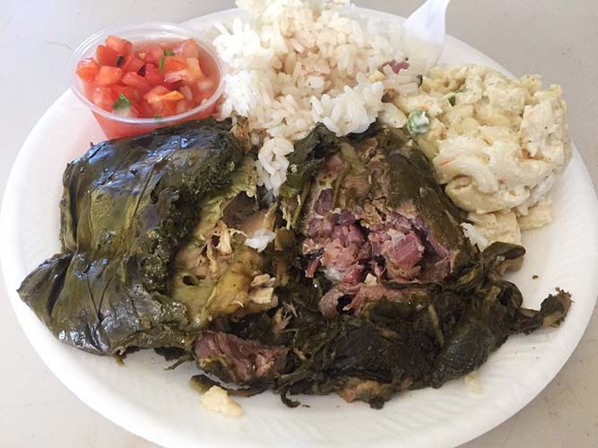 Kaaloa's Super J's is a hidden gem that used to be spread mainly thru word of mouth, until Guy Fieri featured it on his hit show. Janice 'Super J' cooks right out of her own home, and her own family gathers the actual taro leafs used to wrap her lau laus! Everything here is delicious but you absolutely must order the lau lau--juicy pork loin with just the right amount of spice and salt, wrapped in taro leaf and steamed for 6-10 hours. The most authentic Polynesian food you'll find on the island.